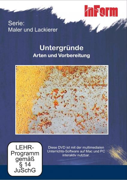 Untergrundprüfung von Holz, Metall, Kunststoff, Putz und Beton • Untergrundbeurteilung • Untergrundsanierung • Untergrundvorbereitung: Reinigung, Schleifen, Entschichten, Absperren, Grundieren, Imprägnieren, Glätten mit Spachtelmasse, Dichtungsmasse • Detaildarstellung von Arbeitsabläufen • Baustellensequenz
